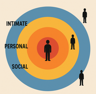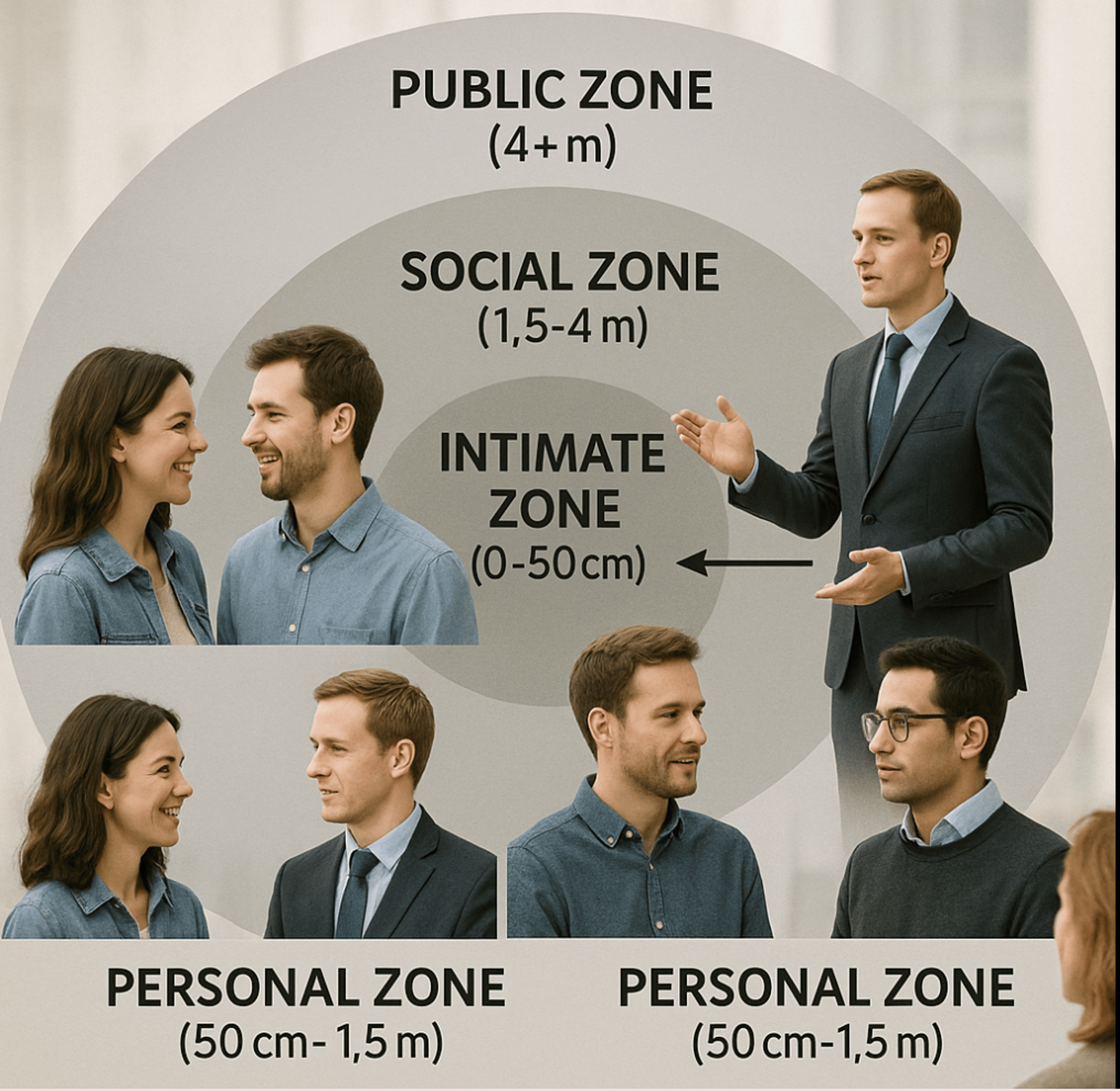 Selon Hall, il existe plusieurs zones de distance qui caractérisent nos interactions. La zone intime, généralement à l'intérieur de 45 cm, est réservée aux proches tels que les amis intimes et les membres de la famille (épouse, copine..). La zone personnelle, qui s'étend de 45 cm à 1,2 m, est utilisée pour les interactions amicales. La zone sociale, de 1,2 m à 3,6 m, s'applique aux relations professionnelles et formelles, tandis que la zone publique, au-delà de 3,6 m, est destinée aux interactions avec des groupes plus vastes.